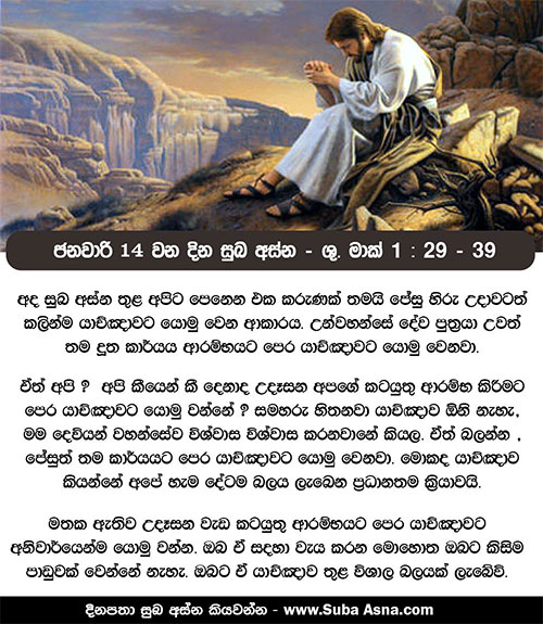 35 හිරු උදාවට බොහෝ කලින් උන් වහන්සේ අවදි ව හුදකලා තැනකට ගොස් එහි යාච්ඤා කළ සේක. 36 සීමොන් සහ ඔහුගේ සහායකයෝ උන් වහන්සේ සොයා ගොස්, 37 සම්මුඛ වී, ”හැම දෙන ම ඔබ සොයති”යි පැවසූ හ. 38 උන් වහන්සේ උත්තර දෙමින්, ”අන් තැන්වලත් දේශනා කරන පිණිස අපි අවට නුවරවලටත් යමු; මා ආයේ ඒ සඳහා ය”යි වදාළ සේක. 39 උන් වහන්සේ ඔවුන්ගේ ධර්මශාලාවල උගන්වමින් ද දුෂ්ටාත්මයන් දුරු කරමින් ද ගලීලය පුරා සැරිසැරූ සේක.