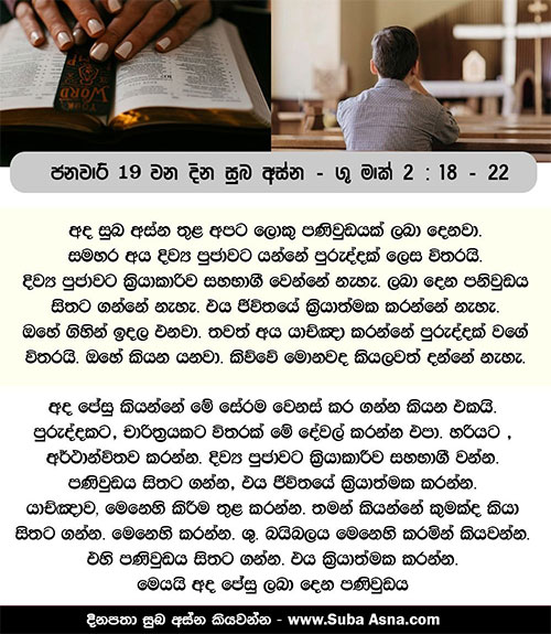 19 උන් වහන්සේ ඔවුන් අමතා මෙසේ වදාළ සේක: ”මනාලයා ඔවුන් සමඟ සිටිය දී ඔහුගේ ඥාති මිත්රාදීන්ට උපවාස කළ හැකි ද? මනාලයා ඔවුන් සමඟ සිටින තුරු ඔවුන්ට උපවාස කළ නොහැකි ය. 20 එහෙත්, මනාලයා ඔවුන් කෙරෙන් වෙන් කරනු ලබන දවසක් පැමිණෙයි. ඒ දවසේ දී ඔවුන් උපවාස කරනු ඇත. 21 තාන් රෙදි කඩකින් පරණ වස්ත්රයකට අණ්ඩයක් දමන කිසිවෙක් නැත, එසේ කළොත්, අලුත් රෙදි කඩට පරණ රෙද්ද ඇදී ඉරුම වඩා ලොකු වේ. 22 අලුත් මිදියුස පැරණි සම් බඳුන්වල වක්කරන කිසිවෙක් නැත. එසේ කළොත්, මිදියුසින් සම් බඳුන් පැළී, මිදියුසත් බඳුනුත් දෙක ම නැති වේ. නව මිදියුස දැමිය යුත්තේ නව බඳුන්වලට ම ය.”