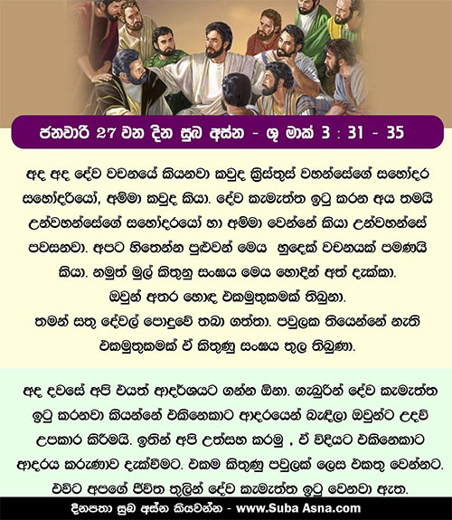 31 එවිට උන් වහන්සේගේ මෑණියෝ ද සහෝදරයෝ ද අවුත් පිටත සිට, උන් වහන්සේ කැඳවා පණිවුඩයක් යැවූ හ. 32 සමූහයක් උන් වහන්සේ අවට වාඩි වී උන්හ. ඔව්හු, ”අන්න, ඔබේ මෑණියෝත්, සහෝදරයෝත්, සහෝදරියෝත් පිටත සිට ඔබ සොයති”යි උන් වහන්සේට කී හ. 33 උන් වහන්සේ උත්තර දෙමින්, ”මාගේ මෑණියෝත්, මාගේ සහෝදරයෝත් කවුරු ද” කියා පෙන්වමින්, 34 තමන් පිරිවරා අවට වාඩි වී සිටියවුන් දෙස වටේට බලා, ”මෙන්න මාගේ මෑණියෝ, මෙන්න මාගේ සහෝදරයෝ! 35 දෙවියන් වහන්සේගේ කැමැත්ත ඉටු කරන කවරෙක් හෝ වෙත් වා, ඔව්හු මාගේ සහෝදරයාත්, මාගේ සහෝදරීත්, මාගේ මෑණියෝත් ය”යි වදාළ සේක.