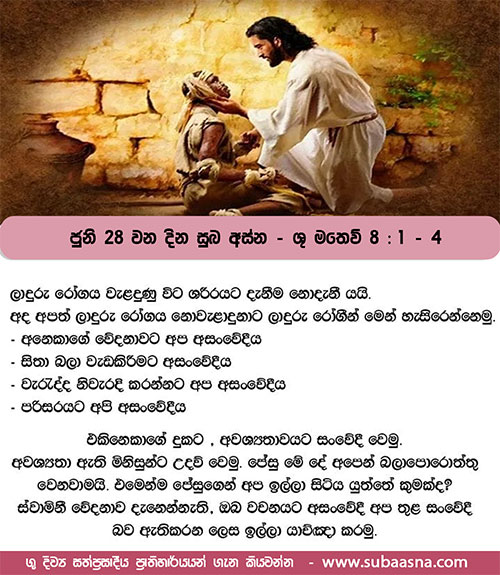1 උන් වහන්සේ කන්දෙන් බැස ආ කල මහා ජනකායක් උන් වහන්සේ පසුපස්සේ ගියහ. 2 එකල ලාදුරු රෝගියෙක් උන් වහන්සේ වෙත අවුත්, වැඳ වැටී, ”ස්වාමීනි, ඔබ කැමැති සේක් නම්, මා පවිත්ර කරන්න ඔබට පුළුවනැ”යි කී ය. 3 උන් වහන්සේ අත දිගු කොට, ඔහු පිට තබා, ”මම කැමැත්තෙමි, පවිත්රවන්නැ”යි වදාළ සේක. එකෙණෙහි ම ඔහුගේ ලාදුරු රෝගය සුව විය. 4 ජේසුස් වහන්සේ කතා කොට, ”මේ ගැන කිසිවෙකුට කිසිවක් නොකියන ලෙස වග බලා ගන්න; එහෙත් යන්න, පූජකයාට පෙනී, මෝසෙස් අණ කළ පඬුර සහතිකයක් පිණිස ඔප්පු කරන්නැ”යි ඔහුට වදාළ සේක.
