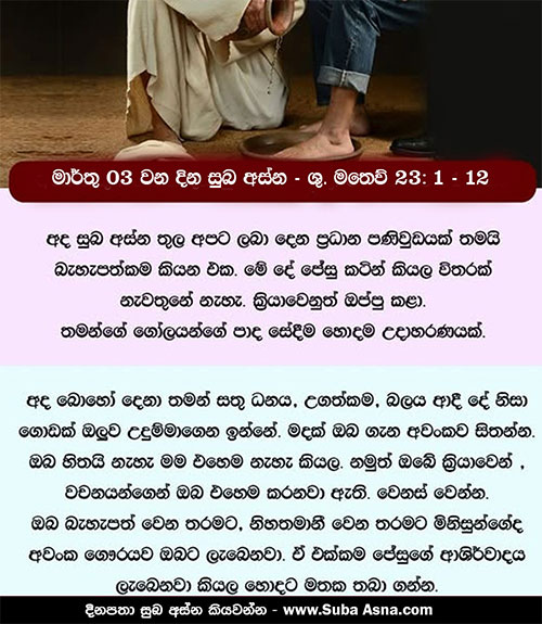 1 එකල ජේසුස් වහන්සේ සමූහයාටත්, සිය ශ්රාවකයන්ටත් කතා කොට මෙසේ වදාළ සේක: 2 ”විනයධරයෝ ද පරිසිවරු ද මෝසෙස්ගේ ව්යවස්ථාවලිය පිළිබඳ බලය ලත් අටුවාචාරීහු වෙති. 3 එබැවින් ඔවුන් ඔබට අණ කරන සියල්ල නොපිරිහෙළා පිළිපදින්න. එහෙත්, ඔවුන්ගේ ක්රියා අනුව නොයන්න. ඔව්හු එකක් කියති, අනිකක් කරති. 4 ඔව්හු ඉසිලිය නොහැකි මහ බර පොදි බැඳ මිනිසුන්ගේ කරේ තබති. එහෙත්, ඒ බර පොදි ඉසිලීමට සුළැඟිල්ලක තරම වත් ආධාරයක් දීමට කැමැති නොවෙති. 5 ඔවුන් හැම දෙය ම කරන්නේ මිනිසුන්ට පෙනෙන පිණිස ය. ඔව්හු ශුද්ධ ලියවිලි පාඨ සඳහන් බඳන පළල් කරගෙන නළලෙහි ද බාහුවල ද පළඳිති. වස්ත්රවල දාවලු මහත් කරති. 6 මංගල්යය භෝජනවල දී මූලාසනයට ද ධර්මශාලාවල දී ප්රධාන අසුන්වලට ද, 7 වෙළඳ පොළවල දී ගෞරවාචාර ලැබීමට ද, මිනිසුන් විසින් ‘ගුරුදේව’ කියා අමතනු ලැබීමට ද ප්රිය කරති. 8 එහෙත්, ඔබ ‘ගුරුදේව’ යයි කියවා නොගන්න. ඔබගේ ගුරුදේවයාණෝ එක් කෙනෙක් ම ය. ඔබ කවුරුත් සහෝදරයෝ ය. 9 මිහි පිට කිසිවෙකුට ‘පියාණෝ’ යි නොකියන්න. ඔබට ඇත්තේ ස්වර්ගයෙහි වැඩ වසන එක ම පියාණන් වහන්සේ ය. 10 ඔබ ‘නායකයෝ’ යි කියවා නොගන්න. ඔබගේ නායකයාණෝ එක් කෙනෙක් ම ය, එනම්, ක්රිස්තුන් වහන්සේ ය. 11 එහෙත්, ඔබ අතරෙන් ඉතා උතුම් තැනැත්තා ඔබගේ සේවකයා වන්නේ ය. 12 තමා ම උසස් කරගන්නා කවරෙකු වුව ද, පහත් කරනු ලබන්නේ ය; තමා ම පහත් කරගන්නා කවරෙකු වුව ද, ඔහු උසස් කරනු ලබන්නේ ය.
