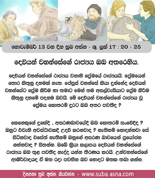 20 ”දෙවියන් වහන්සේගේ රාජ්යය කවර කලෙක පහළ වන්නේ දැ”යි පරිසිවරුන් ඇසූ බැවින්, උන් වහන්සේ ඔවුන්ට උත්තර දෙමින්, ”දෙවියන් වහන්සේගේ රාජ්යය ඇසට පෙනෙන අයුරින් නොපැමිණෙයි. 21 මෙන්න මෙතැන ය, අන්න අතැන යයි කිසිවෙකුට කිව නොහැකි ය; මන්ද, දෙවියන් වහන්සේගේ රාජ්යය ඔබ gඅතරෙහි ය”යි වදාළ සේක.