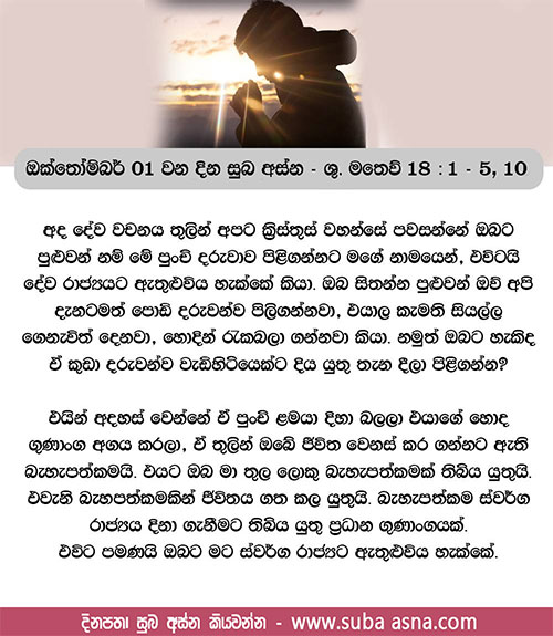 1 එවේලෙහි ශ්රාවකයෝ ජේසුස් වහන්සේ වෙතට අවුත්, ”ස්වර්ග රාජ්යයෙහි ඉතා ම උතුම් වන්නේ කවරෙක් දැ”යි ඇසූහ. 2 එවිට උන් වහන්සේ කුඩා දරුවෙකු තමන් වෙතට කැඳවා ඔවුන් මැද සිටුවා මෙසේ වදාළ සේක: 3 ”සැබැවින් ම මම ඔබට කියමි, ඔබ වෙනස් වී කුඩා දරුවන් මෙන් නොවූවොත්, කිසි සේත් ස්වර්ග රාජ්යයට ඇතුළු නො වන්නහු ය. 4 එබැවින් මේ කුඩා දරුවා මෙන් යටහත් වන යමෙක් ඇද්ද, ස්වර්ග රාජ්යයෙහි ඉතා ම උතුම් වන්නේ ඔහු ය. 5 තවද, යමෙක් මාගේ නාමයෙන් මෙවැනි කුඩා දරුවෙකු පිළිගන්නේ ද ඔහු මා පිළිගන්නේ ය.” 10 ”මේ බාලයන්ගෙන් එකෙකු වත් හෙළා නොදැකීමට වගබලාගන්න. මන්ද, ‘ස්වර්ගයෙහි ඔවුන්ගේ දේව දූතයෝ ස්වර්ගයෙහි වැඩ වසන මාගේ පියාණන් වහන්සේ ඉදිරියෙහි නිරතුරු ම සිටිති’යි මම ඔබට කියමි.