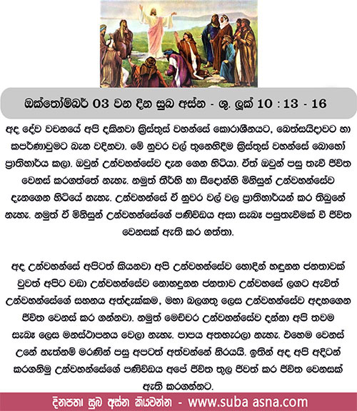13 ”එම්බා කොරාශීනය, ඔබට වන විපතක මහත! එම්බා බෙත්සයිදාව, ඔබට වන විපතක මහත! ඔබ තුළ කළ ප්රබල ක්රියා තීර්හි හා සීදොන්හි කළා නම්, මීට කලින් ගෝනි රෙදි හැඳ අළු තවරා ගෙන පසුතැවී සිත් හරවා ගැනීමට ඔවුන්ට ඉඩ තිබිණි. 14 එසේ වුව ද දේව විනිශ්චය දවසේ දී ඔබට වඩා තීර්ට හා සීදොනට සහනය ලැබෙන්නේ ය. 15 එම්බා කපර්ණවුම, ඔබ සගලොව දක්වා උසස් කරනු ලබන්නෙහි ද? නැත, පාතාලය දක්වා පහත හෙළනු ලබන්නෙහි ය. 16 ඔබගේ වචන අසන්නා මාගේ වචන අසයි; ඔබ ප්රතික්ෂේප කරන්නා මා ප්රතික්ෂේප කරයි; මා ප්රතික්ෂේප කරන්නා මා එවූ තැනැන් වහන්සේ ප්රතික්ෂේප කරන්නේ ය.”
