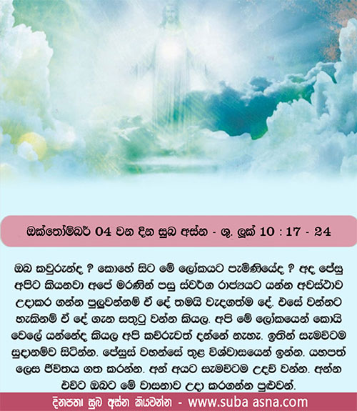 ඔක්තෝම්බර් 04 වන දින සුබ අස්න – ශු. ලූක් 10: 17 – 24