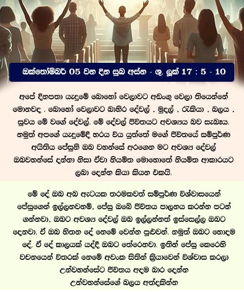 5 එවිට ප්රේරිතයෝ කතා කොට, ”අපේ ඇදහිල්ල වැඩි කළ මැනවැ”යි සමිඳාණන් වහන්සේට කී හ. 6 සමිඳාණන් වහන්සේ කතා කොට, ”අබ ඇටයක් පමණ ඇදහිල්ල ඇති ව, මේ ඇඹිල්ල ගහට, ‘ඉදිරී ගොස්, මුහුදේ පැලවෙව’යි කියන්නහු නම්, එය ඔබට කීකරු වනු ඇත. 7 එහෙත්, ඔබ අතරෙන් යමෙකුට සීසාන හෝ බැටළුවන් බලන හෝ දාසයෙක් සිටී නම් කෙතේ සිට ආ කල, ‘වහාම ඇවිත් කෑමට ඉඳ ගන්නැ’යි කියන්නෙහි ද? 8 එසේ නොව, ‘මට කෑම බීම පිළියෙළ කොට, ඇඳගෙන ලෑස්ති වී, කා බී නිම වන තුරු මට උපස්ථාන කරන්න; ඉන්පසු ඔබ කන්න බොන්නැ’යි කියන්නේ නැද් ද? 9 ඒ දාසයා තමාට අණ කළ දේ කළ බැවින් ස්වාමියා ඔහුට ස්තුති කරයි ද? නැත. 10 එසේ ම ඔබත් ඔබට අණ කළ සියල්ල කළ පසු, ‘අපි දාසයෝ ය, ස්තුතියක් අපට හිමි නැත, කළ යුතු දෙය පමණක් අපි කෙළෙමු’යි කියන්නැ”යි වදාළ සේක.