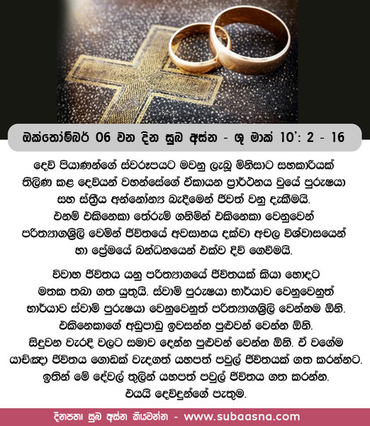 2 පරිසිවරු අවුත් උන් වහන්සේ වචනයකින් අල්ලාගනු පිණිස, ”පුරුෂයෙකු විසින් සිය භාර්යාව දික්කසාද කිරීම නීතියට අනුකූල දැ”යි උන් වහන්සේගෙන් ප්රශ්න කළහ. 3 උන් වහන්සේ උත්තර දෙමින්, ”මෝසෙස් ඔබට කුමක් අණ කෙළේ දැ”යි ඔවුන්ගෙන් ඇසූ සේක. 4 ”දික්කසාද සහතිකයක් ලියා ඇය අත්හැර දමන්න මෝසෙස් අවසර දුන්නේ ය”යි ඔව්හු කී හ. 5 එහෙත්, ජේසුස් වහන්සේ ඔවුන්ට කතා කොට, ”ඔහු මේ ආඥා පැණවූයේ, ඔබේ සිත් දැඩිකම නිසා ය. 6 එහෙත්, මැවීමේ මුල සිට ම දෙවියන් වහන්සේ ඔවුන් ස්ත්රී-පුරුෂ වශයෙන් මැවූ සේක. 7 ඒ හේතුකොට ගෙන මිනිසෙක් තම පියා ද මව ද අතහැර සිය භාර්යාවට ඇලුම් වන්නේ ය. 8 ඒ යුවළ ද එක ම මාංසයක් වෙති. මෙසේ ඔව්හු එවක් පටන් දෙදෙනෙක් නොව එක් කෙනෙක් වන්නෝ ය. 9 එබැවින් දෙවියන් වහන්සේ එක්කළ අය මනුෂ්යයා වෙන් නොකෙරේ වා!”යි වදාළ සේක.