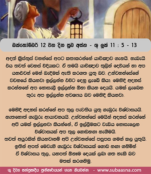 5 තවද උන් වහන්සේ ඔවුන්ට කතා කරමින්, ”ඔබ අතර මිතුරෙකු ඇති තැනැත්තෙක් මහ රෑ ඔහු වෙත ගොස්, ‘මිත්රය, මට රොටි තුනක් දෙන්න; 6 ගමනක් යන මාගේ මිත්රයෙක් මා වෙත අවුත් සිටියි; ඔහුට දෙන්න කිසිවක් මා ළඟ නැතැ’යි කියන්නේ නම්, 7 ගේ ඇතුළේ සිට ඒ මිතුරා, උත්තර දෙමින්, ‘මට කරදර නොකරන්න, දැන් දොර වසා තිබේ; මාගේ දරුවෝ ද මා සමඟ ඇඳේ නිඳා සිටිති; නැඟිට යමක් ඔබට දෙන්නට නොහැකි ය’යි කියයි ද? 8 මම ඔබට මෙය කියමි, ඔහු සිය මිත්රකම සලකා නැඟිට ඔහු ඉල්ලන දේ ඔහුට නොදෙතත් ඔහුගේ ලජ්ජා නැති පෙරැත්තය නිසා නැඟිට, වුවමනා පමණ ඔහුට දෙනු ඇතැ”යි වදාළ සේක. 9 ”මම ද ඔබට කියමි, ඉල්ලන්න, ඔබට දෙනු ලැබේ; සොයන්න, ඔබට සම්බ වේ; තට්ටු කරන්න, ඔබට දොර අරිනු ලැබේ. 10 මන්ද ඉල්ලන හැමට ලැබේ; සොයන්නාට සම්බ වේ; තට්ටුකරන්නාට දොර හරිනු ලැබේ. 11 ඔබ අතරෙන් කවර පියෙක් තම පුත්රයා මාළුවකු ඉල්ලූ විට මාළුවා වෙනුවට සර්පයෙකු දෙයි ද? 12 නොහොත් බිත්තරයක් ඉල්ලූ විට ඔහුට ගෝනුස්සකු දෙයි ද? 13 මෙසේ අයහපත් වූ ඔබ, ඔබේ දරුවන්ට යහපත් දේ දෙන්නට දන්නාහු නම්, ඊට කොපමණ වැඩියෙන්, ඔබේ ස්වර්ගීය පියාණන් වහන්සේ තමන් වහන්සේගෙන් ඉල්ලන්නන්ට ශුද්ධාත්මයාණන් නොදෙන සේක් ද?”