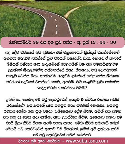 22 උන් වහන්සේ ජෙරුසලම බලා යද්දී නගර හා ගම් නියම්ගම් මැදින් අනුශාසනා කරමින් වැඩි සේක. 23 එක් කෙනෙක් කතා කොට, ”ස්වාමීනි, ගැළවීම ලබන්නෝ ස්වල්ප දෙනෙක් පමණක් දැ”යි උන් වහන්සේගෙන් ඇසී ය. උන් වහන්සේ ඔවුන්ට කතා කොට මෙසේ වදාළ සේක: 24 ”පටු දොරෙන් ඇතුළු වන්නට වීර්ය කරන්න. මන්ද, බොහෝ දෙනෙක් ඇතුළු වන්නට සොයන නමුත් ඔවුන්ට නොහැකි වේ ය යි මම ඔබට කියමි. 25 ගෙදර ස්වාමියා නැඟිට දොර වැසූ පසු ඔබ පිටත සිට දොරට තට්ටු කරමින්, ‘ස්වාමීනි, අපට දොර හැරිය මැනවැ’යි කියන කල, ‘නුඹලා කොතැනින් ආවාහු දැ යි නොදනිමි’යි ඔහු පිළිතුරු දෙනු ඇත. 26 එවිට ඔබ: ‘අපි ඔබ සමඟ කෑවෙමු, බීවෙමු, ඔබ අපේ වීදිවල ඉගැන්වූ සේකැ’යි කියන්නහු ය. 27 එහෙත් ඔහු කතා කොට, ‘නුඹලා කොතැනින් ආවාහු දැ යි මම නොදනිමි. අදමිටුකම් කරන නුඹලා සියලු දෙනා ම මා කෙරෙන් පලා යව්’ යයි කියන්නේ ය. 28 ආබ්රහම් ද ඊසාක් ද ජාකොබ් ද සියලු දිවැසිවරයන් ද දෙවියන් වහන්සේගේ රාජ්යයෙහි සිටිය දී ඔබ පිටතට දමනු ලබන කල එහි විලාප කීම ද දත්මිටිකෑම ද ඇති වේ. 29 තවද, මනුෂ්යයෝ පෙරදිගින් හා අපරදිගින් ද උතුරු දිගින් හා දකුණු දිගින් ද පැමිණ දෙවියන් වහන්සේගේ රාජ්යයෙහි මංගල භෝජනයට අසුන් ගන්නෝ ය. 30 මෙන්න, දැන් අන්තිමයන් ව සිටින සමහරු ප්රථමයෝ ද දැන් ප්රථමයන් ව සිටින සමහරු අන්තිමයෝ ද වන්නෝ ය.”