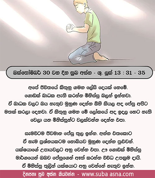 31 ඒ මොහොතේ දී ම පරිසිවරුන්ගෙන් සමහරෙක් පැමිණ, ”මෙතැනින් අහක් ව ගිය මැනව. මන්ද, හෙරොද් ඔබ මරනු රිසියෙන් සිටින්නේ ය”යි කී හ. 32 උන් වහන්සේ ඔවුන්ට කතා කොට මෙසේ වදාළ සේක: ”ඔබ ගොස් ඒ හිවලාට මෙසේ කියන්න: අදත්, හෙටත් මම දුෂ්ටාත්මයන් දුරු කොට රෝග සුව කරමි. තුන් වැනිදා මාගේ පරමාර්ථය මුදුන් පත් කරගන්නෙමි, 33 එසේ වුව ද, අදත්, හෙටත්, අනිද්දාත් මා චාරිකාවෙහි යෙදිය යුතු ය: කුමක් හෙයින් ද, දිවැසිවරයෙකුගේ මරණය ජෙරුසලමෙන් පිටත දී සිදුවිය නොහැකි ය.”