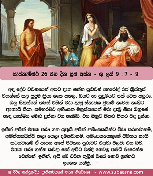 7 යුවරජ හෙරොද්, උන් වහන්සේ කළ සියල්ල අසා, අතිශයින් වියවුල් විය. එසේ වූයේ, ‘ජොහන් මළවුන් කෙරෙන් උත්ථාන වී ය’ කියාත්, 8 සමහරුන්, ‘එලියා පහළ වූයේ ය’ කියාත්, අන් සමහරුන්, ‘පෙර සිටි දිවැසිවරයන්ගෙන් කෙනෙක් උත්ථාන වී ය’ කියාත් කී බැවිනි. 9 එවිට හෙරොද්, ”මම ජොහන්ගේ හිස සිඳ දැමීමි; එහෙත්, මට සැළ වී ඇති මෙබඳු දේ කරන මේ තැනැත්තා කවරෙක් දැ”යි ඇසී ය. ඔහු උන් වහන්සේ දැකීමට වෑයම් කෙළේ ය.